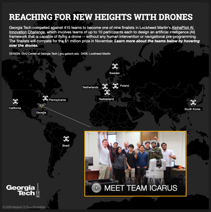 To reach the finals, the team – comprised of ten Georgia Tech students ranging from undergraduate to Ph.D. students – competed in a series of qualifying rounds. Each round tested a different component of the drone including drone control, vision, and a team game plan. Icarus successfully completed each round knocking out over 415 teams from 81 countries.