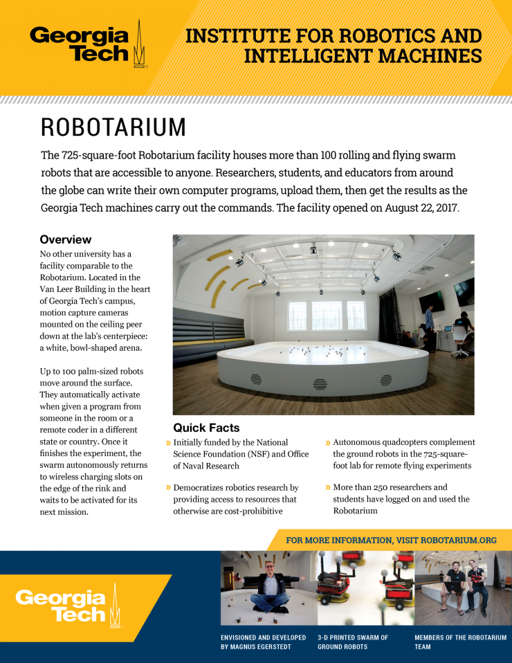 The Robotarium project provides a remotely accessible swarm robotics research platform that remains freely accessible to anyone. Opened on August 22, 2017, the 725-square-foot facility houses more than 100 rolling and flying swarm robots that are accessible to anyone. Researchers from around the globe can write their own computer programs, upload them, then get the results as the Georgia Tech machines carry out the commands.