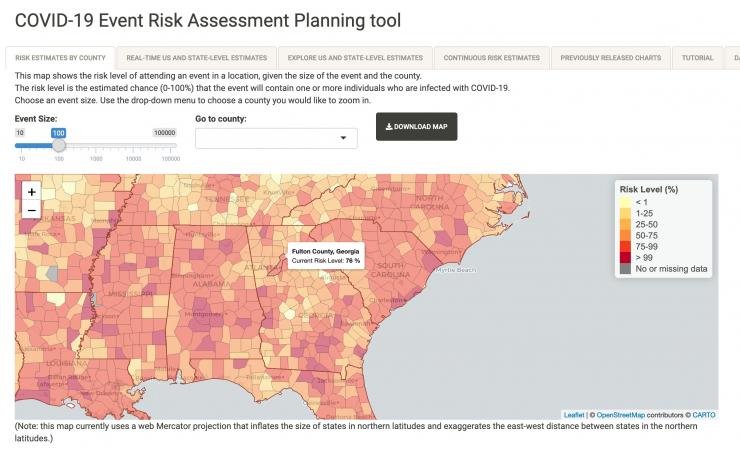 The new “Covid-19 Event Risk Assessment Planning Tool” is the work of Joshua Weitz, professor in the School of Biological Sciences and founding director of Georgia Tech’s Ph.D. in Quantitative Biosciences program, in collaboration with the lab of Clio Andris, an assistant professor in the School of City and Regional Planning with a joint appointment in the School of Interactive Computing at Georgia Tech, and with researchers from the Applied Bioinformatics Laboratory (a public/private partnership between Georgia Tech, IHRC Inc., and ASRT Inc.).