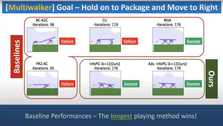In the latter — where the goal is for one team of agents to defeat another — the InfoPG architecture showed very advanced strategies. Seraj said agents in one case learned to form a triangle formation, sacrificing the front agent while the two other agents eliminated the enemy. Without InfoPG in play, an agent abandoned its team to save itself.